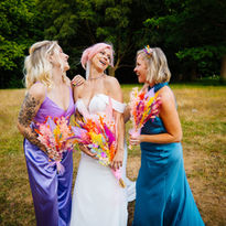 Bright and bold florals set this woodland ceremony space alight with colour. Mixing perfectly with the festival energy this venue gives. A truly colourful celebration.